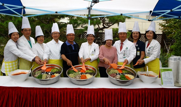 지난 17일 위암·대장암협진센터 개소 4주년을 맞아 이대목동병원 3층 이화쉼터에서 개최된 '환우와 함께 만들고 맛보는 건강 비빔밥 만들기' 행사에서 의료진들이 평소 근엄한 의사의 모습을 벗어 던지고 환우들과 함께 비빔밥을 만들었다. 이순남 의무부총장 겸 의료원장과 유권 병원장, 김광호 위암·대장암협진센터장과 위암, 대장암 환우회 대표 등 의료진들과 요리사 모자를 쓰고 환우·가족들과 양푼에 담긴 각종 오색 채소와 밥으로 함께 비빔밥을 만들고 이화쉼터를 찾은 환자들과 서로 음식을 나눠먹으며 환자들의 쾌유를 빌었다. 이날 행사에 참여한 환우들은 "평소 병실과 진료실에서 보던 근엄한 모습이 아닌 직접 비빔밥을 비벼주는 모습이 친근하게 느껴졌다"며 그동안 진료실에서 보던 의료진의 평소 모습과는 다른 색다른 모습에 즐거워했다. 이와 함께 병원 로비에서는 방문객과 환자, 보호자들을 대상으로 '마음을 글씨에 담아 전하는 메시지-캘리그라피' 증정 행사가 진행됐다. 캘리그라피란 글씨를 아름답게 쓰는 기술을 뜻하는 것으로 요즘 많은 사람들이 나만의 개성을 표현하고 정성이 담긴 메시지로 감동을 전할 수 있어 내원 환자나 보호자들에게 큰 인기를 끌었다. 김광호 위암·대장암협진센터장은 "이대목동병원 위암·대장암협진센터 개소 4주년을 기념해 열린 오늘 행사는 암을 이겨낸 분들을 축하하는 의미와 함께 투병 중인 분들에게 희망과 용기를 주기 위해 마련된 자리로 많은 사람이 참여해 더욱 즐거웠다"고 말했다. |