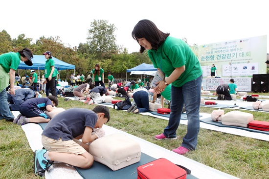 용산구청과 용산경찰서, 용산소방서가 함께 주최하고 대한노인회용산지회, 구립용산장애인복지관, 한국당뇨협회가 후원한 이번 건강걷기대회에는 성장현 용산구청장과 진영 전 보건복지부 장관, 박길준 용산구의회 의장과 의원, 일반시민 약 800여명이 참석했다. 개원 40주년을 기념해 열린 건강걷기대회는 '가족의 이웃과 생명을 살리는 심폐소생술'을 슬로건으로 다채롭게 진행했다. 걷기대회에 참가한 주민들은 먼저 혈압, 혈당과 당화혈색소 무료검사를 받고 영양 및 건강 상담을 받았다. 이어서 조영신, 박준범 순천향대서울병원 응급의학과 교수의 주도로 심폐소생술 교육이 2시간 가량 진행되었고 주민들은 준비된 모형으로 흉부압박과 인공호흡을 직접 실시하여 심폐소생술의 중요성을 깨달았다. 이재승 JTBC 기자의 사회로 막을 올린 식전 행사는 세계에서 실력을 인정받은 비보이팀 비쥬얼 쇼크가 팝핀과 브레이크댄스로 흥을 돋궈주었고 본격적인 걷기를 시작하기에 앞서 국내 최고의 휘트니스팀 어벤져스가 준비체조로 참가자들의 몸을 풀어주었다. 용산구 경찰서는 포돌이 인형과 아이들이 피켓을 들고 4대악 근절 캠페인을 벌였고 용산구 보건소도 대사증후군 검진, 감염병 및 치매예방 홍보를 함께 했다. 행사의 하이라이트 걷기대회는 용산 가족공원 두 바퀴를 걷고 난 후 주민들에게 자전거와 혈압계, 만보기 등 푸짐한 경품을 나눠주며 끝이 났다. 서유성 병원장은 "여러 힘든 사회적 분위기 속에서도 걷기대회에 참여해주신 분들에게 감사의 마음을 전한다"며 "일회성으로 그치는 걷기 대회가 아니라 이번 심폐소생술 체험처럼 배우고 경험하는 유익한 대회로 정착 시키겠다"고 말했다. |