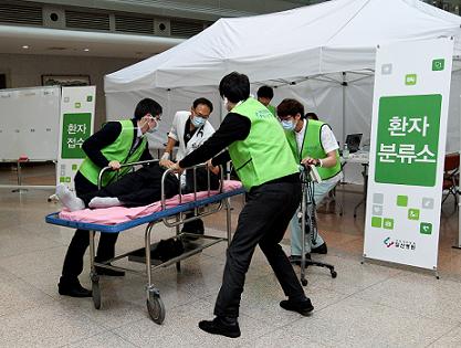이번 훈련은 각종 안전사고 발생으로 인해 대형 인명피해가 늘어나고 있는 요즘사고 발생시 응급치료에 대한 대응 및 임무수행 능력을 배양하고 응급치료의 중요성을 알리는 내용으로 구성됐다. 이날 훈련은 병원 인근 공공기관 건물에서 원인불상의 사고로 건물이 붕괴되고 화재가 발생해 대량 사상자가 발생 했다는 가정 하에 대량 사상자가 병원 응급의료센터로 유입되는 상황으로 응급의료센터 수용인원을 초과하여 1층 로비에 치료 공간을 마련하고 응급처치를 시행하는 훈련으로 실시됐다. 특히 타병원에서 보기 힘든 로비 벽면에서 중환자들에게 필요한 의료가스가 공급되는 Wall care zone은 응급의료센터 외에도 병원 로비에서 신속하게 응급의료 환자를 진료할 수 있다는 점을 입증하며 훈련을 지켜보던 환자와 보호자들에게 큰 호평을 받았다. 김광문 병원장은 “대형 재난상황에서 신속한 진료는 환자의 생명에 큰 영향을 미치는 만큼 빠른 응급치료가 무엇보다 중요하다”며 “이번 훈련을 통해 의료진, 간호인력, 행정인력이 자신의 역할을 숙지하고 이를 바탕으로 실제상황에서도 모두 자신의 역할을 충실히 이행해 소중한 생명을 지켜낼 수 있도록 최선의 노력을 다하겠다”고 말했다. |