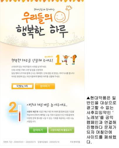 현대약품은 공익캠페인을 회사 메인 홈피가 아닌 법적으로 광고를 할 수 없는 전문약 홈페이지를 통해 진행해 간접광고가 아니냐는 지적을 사기도 했다. 현대약품은 이같은 지적이 일부에서 제기되자 개설 며칠만에 해당 홈페이지를 삭제했다.