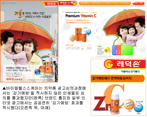 바이엘헬스케어는 최근 일반의약품인 ‘레덕손 더블액션’의 의약품 광고를 집행하면서 감기예방 효과를 적시하지 않은 인쇄물을 통해 심의를 통과 받았지만 의약품광고심의위원회의 힘이 미치지 않은 브랜드 홈페이지(www.redoxon.co.kr) 및 인터넷 광고를 통해서는 ‘감기예방 효과’라는 문구를 버젓이 사용했다. 비타민C의 감기 예방효과를 두고 의약계에서는 90년대까지는 논란이 있었지만 2000년대에 접어 들면서 연관성이 없다는 사실이 밝혀진바 있다.