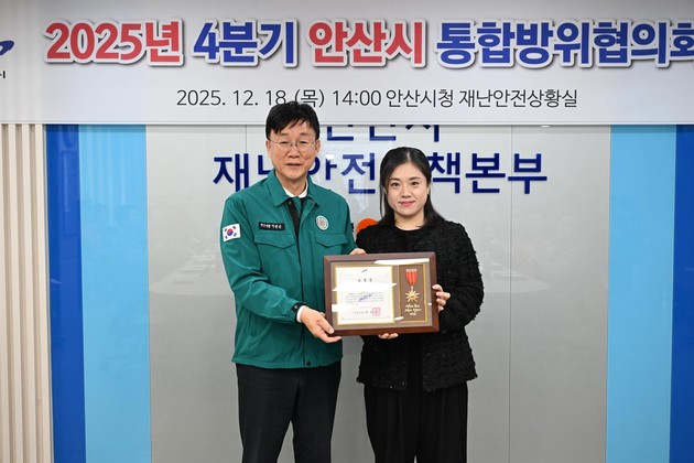 고대안산병원 응급의학과 신진화 책임간호사가 지난 18일 안산시청 재난안전상황실에서 열린 '2025년 4분기 안산시 통합방위협의회'에서 을지연습 유공 안산시장 표창을 받았다.