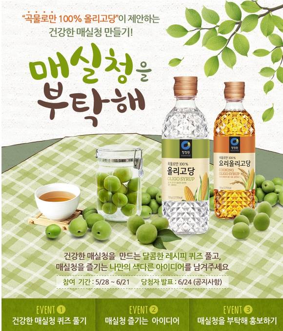 대상 청정원은 본격적인 매실 철을 맞아 오는 21일까지 청정원 홈페이지에서 ‘곡물로만 100% 올리고당’과 함께하는 ‘매실청을 부탁해’ 이벤트를 진행한다. 퀴즈풀이와 아이디어 공유 등 누구나 참여할 수 있는 온라인 이벤트다.
