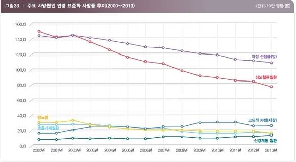 특히 순환기계 질환, 당뇨병, 만성 하기도질환, 암은 만성질환으로 인한 사망의 70%를 차지(전체 사망자의 57%)했다. 고혈압, 고콜레스트롤혈증, 당뇨병, 비만 등은 관리암 잘하면 심근경색이나 뇌졸중 등 심각한 질환으로 이어지는 것을 막을 수 있는데도 치료율은 낮았다. 성인 10명중 3명이 앓고 있는 고혈압은 치료율이 53.6%에 불과했고 고콜레스트롤혈증은 14.8%에 불과했다.