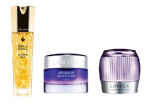 ▲왼쪽부터 겔랑 ‘데일리 리페어 세럼’, 랑콤 ‘레네르지 반중력 오일 마사지 크림’, 코리아나화장품 ‘라비다 실리프팅크림’.