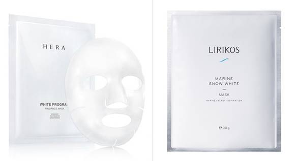 ▲헤라 ‘화이트 프로그램 래디언스 마스크’와 리리코스 ‘마린 스노우 화이트 마스크’.