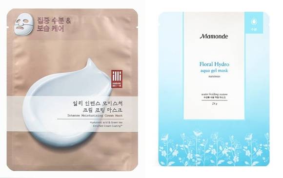 ▲일리 ’인텐스 모이스처 크림 코팅 마스크’와 마몽드 ‘플로랄 하이드로 아쿠아 젤 마스크’.