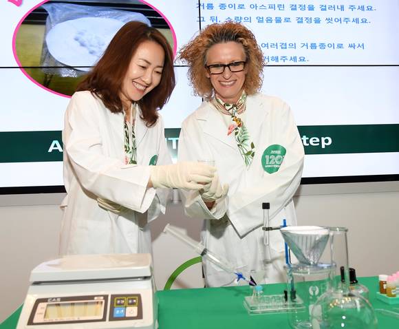 ▲바이엘 아스피린 합성 120주년 기념 사내 행사에서 잉그리드 드렉셀 바이엘코리아 대표(오른쪽)와 이진아 심혈관질환치료제사업부 총괄(왼쪽)이 아스피린 합성 실험 퍼포먼스를 선보이고 있다.