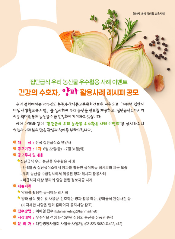 오는 7월 31일(화)까지 실시할 1차 이벤트 주제는 ‘건강의 수호자, 양파 활용사례 레시피’이며 응모내용은 집단급식소에서의 평소 양파사용량, 5~6월 중 양파를 활용한 급식메뉴 레시피, 영양 정보제공 사례 등으로 구성하면 된다.
