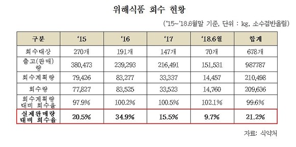 또 이들 위해식품의 회수계획량 대비 회수율(물량 기준)은 2015년 97.9%, 2016년 100.2%, 2017년 100.5%이며 올해 상반기 회수율은 102.1%로 회수실적이 매우 높은 것으로 나타났다.
