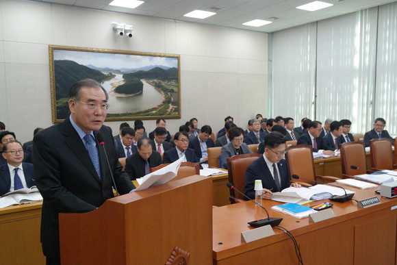 10일 국회에서 농림수산식품부의 국정감사가 시작된 가운데 이개호 농식품부 장관이 농림축산식품해양수산위원회 소속 의원들의 질의에 앞서 업무 보고를 통해 농어촌 상생협력기금 조성 현황과 향후 계획 등을 밝히고 있다.