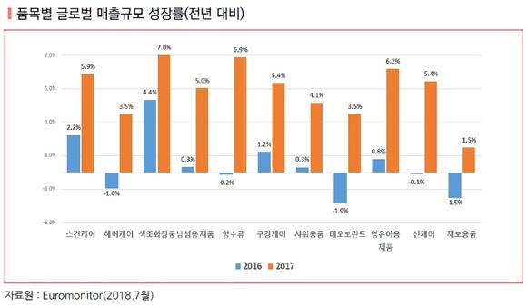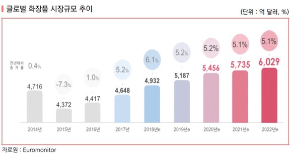 글로벌 화장품 산업은 2016년까지 성숙산업의 특성과 함께 유럽 재정위기, 신흥국 통화 평가절화 등으로 저성장 국면을 경험한 바 있다. 하지만 신진시장의 새로운 소비 트렌드 부상과 신흥시장의 소득향상에 따른 매출 확대로 향후 5년간 연평균 5% 이상의 매력적인 성장산업으로 급부상했다.