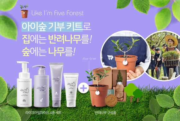 배우 유진이 직접 기획하고 제품 개발까지 참여한 라이크아임파이브(Like I‘m Five)는 지난해 11월 미세먼지 방지를 위한 숲 조성으로 ‘아이숲 캠페인’을 시작하며 ‘아이숲 기부 키트’를 출시했다. 라이크아임파이브 제품 4종으로 구성된 ‘아이숲 기부 키트’ 특별 패키지 상품 구매 시, 반려나무도 받고 미세먼지 방지 숲에 나무도 심어진다.