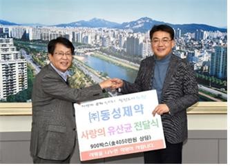 동성제약(대표이사 이양구)은 지난 12일 노원구청 구청장실에서 4,000만원 상당의 바이오가이아 유산균을 전달했다.