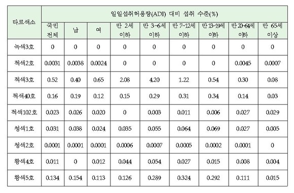 식품유형별 평균 함량을 토대로 일일노출량을 추정한 결과, 식용타르색소 9종 중 적색 제3호가 상대적으로 높은 노출량을 보였으나 일일섭취허용량(0.1 mg/kg bw/day) 대비 0.52%(0.52 µg/kg bw/day)로 매우 안전한 수준이었다는 설명이다.