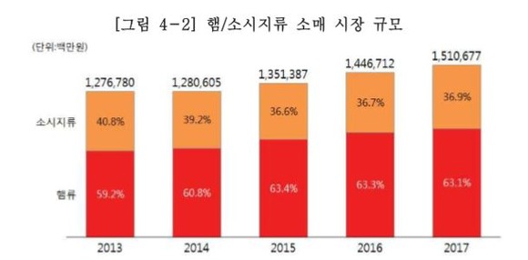 햄·소시지류 소매시장 규모는 2017년 1조5107억원으로 추정되며, 이는 2013년 1조2768억원 에 비해 18.3% 증가한 규모다. 2017년 판매액 기준, 햄이 9530억원(63.1%), 소시지가 5577억원(36.9%)으로 나타났다. 햄 종류별로는 일반햄이 5143억원, 캔햄이 4387억원으로 일반햄의 판매 규모가 조금 더 크게 나타났다.