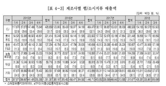 품목별 주요 업체를 살펴보면, 햄류와 소시지류 모두 CJ제일제당, 롯데푸드, 동원F&B 등이 상위를 차지하고 있다.