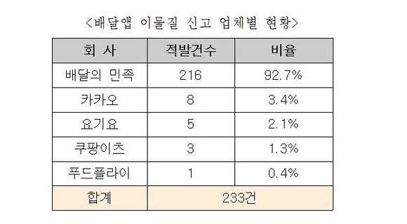 법이 시행된 7월 16일부터 8월 31일까지 1달 반 기간의 신고현황을 살펴보면, 업체별로는 배달의 민족이 216건으로 92.7%로 대부분을 차지했고, 그 뒤를 카카오 8건, 요기요 5건, 쿠팡이츠 3건, 푸트플라이 1건이 신고됐다. 지역별로는 서울이 122건으로 절반이상을 차지했고, 경기도 33건, 부산 14건, 인천 13건으로 뒤를 이었다.