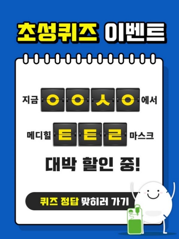 이번 초성퀴즈 문제는 “지금 ㅇㅇㅅㅇ에서 메디힐 ㅌㅌㄹ 마스크 대박 할인 중!”으로 문장 속 초성의 정답을 맞추면 된다. 정답에 대한 힌트는 포털 사이트 검색창에서 ‘올리브영 메디힐’ 검색 시 나오는 이벤트 페이지에서 확인할 수 있다. 퀴즈의 정답은 ‘올영세일 티트리’다.