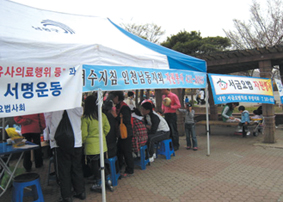 지난 4월 14일 인천대공원에서 인천남동.부평지회(지회장 장은숙 032-431-8063) 소속 수지침사 30여명이 오전 10시부터 오후 5시까지 하루 종일 500여명의 시민을 대상으로 서금요법 자원봉사를 실시했다. 때마침 벚꽃 축제기간으로 수많은 상춘객이 몰려들어 서금요법 봉사활동은 대성황을 이루었다. 손목통증으로 고생하던 정모(70대ㆍ여)씨는 “말로만 들었던 고려수지침을 시술받으니 참으로 좋습니다.”면서 “수지침사 선생들이 친절하게 시술해주어 통증이 호전되어 벚꽃구경이 더욱 즐거웠습니다”라고 말했다. 한편 봉사단원들은 서금요법 시술과 더불어 ‘수지침사법 추진 100만명 서명운동’도 함께 전개했다. |