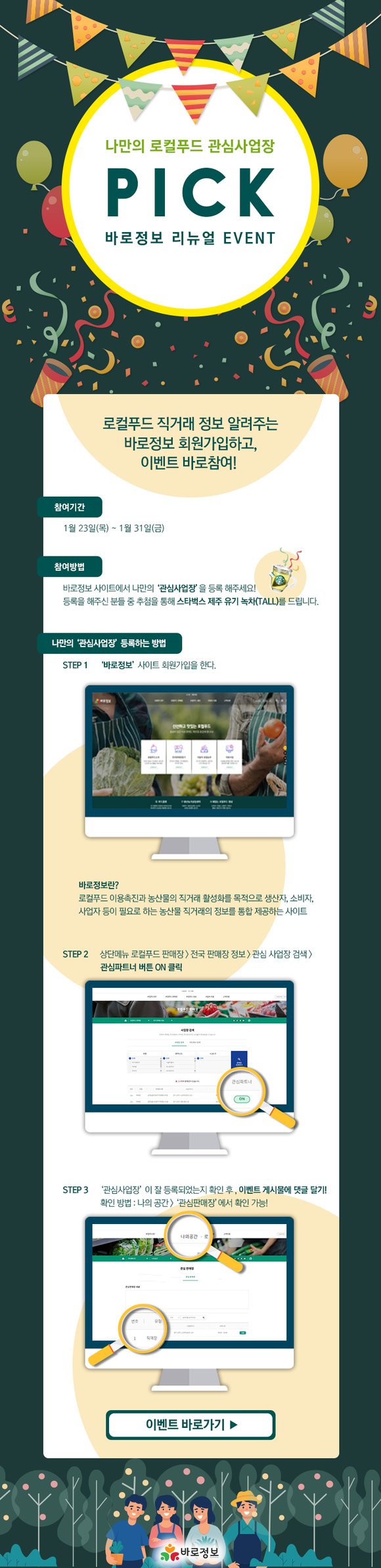 aT는 바로정보 개편 기념 이용자 이벤트를 1월 23일부터 31일까지 실시한다. 나만의 로컬푸드 판매장을 찾아 관심매장으로 등록하면 추첨을 통해 국산차 무료 이용 쿠폰을 받을 수 있다.