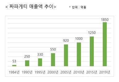 농심 짜파게티가 출시 후 지난달까지 국내에서 판매된 양은 총 75억개. 신라면(34년간 325 억개) 과 안성탕면(37년간 153억개) 다음으로 많이 팔렸다. 현재까지 판매된 짜파게티를 넓이로 계산했을 때 축구장 35개 면적을 덮고도 남으며, 일렬로 연결하면 그 길이가 지구 둘레 40배에 달한다.