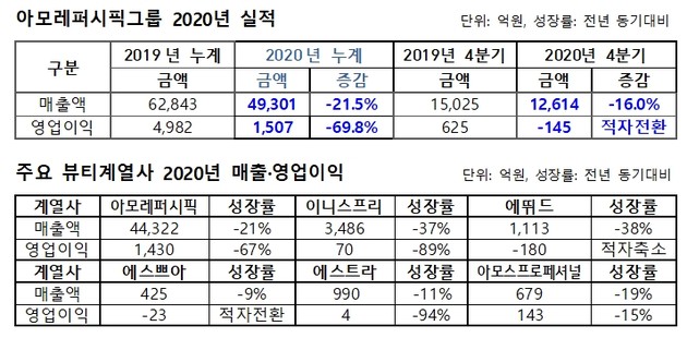 아모레퍼시픽그룹이 지난해 코로나19 여파에서 벗어나지 못했다. 국내는 물론 전 세계적으로 거리두기 조치가 시행되고 글로벌 관광객이 급감하며 오프라인 채널에서 특히 어려움을 겪었다. 회사 측에 따르면 2020년 전체 매출은 4조9301억원으로 전년대비 21.5% 감소했다. 영업이익은 1507억원으로 69.8%나 줄었다.