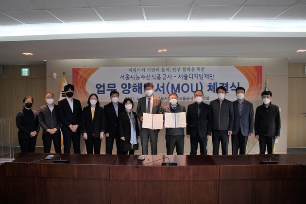 서울시농수산식품공사(사장 김경호, 이하 ‘공사’)와 서울디지털재단(이원목 이사장 직무대행)은 빅데이터 분석·연구 협력을 위해 4월 1일 공사에서 업무협약(MOU)을 체결했다. 이번 협약은 공사가 보유하고 있는 내부 데이터와 외부 데이터를 결합한 빅데이터 기반의 분석 연구를 통해 공사 현안 해결에 대한 기준 정립 및 신규 서비스 창출 등에 활용하고자 이뤄졌다.