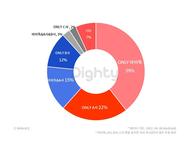 통합 데이터 솔루션 '다이티(Dighty)’가 국내 성형정보 앱 설치 현황을 분석한 결과 4월 초 기준 전체 성형 앱 유저의 57%가 바비톡을 이용하고 있었으며, 다른 앱 없이 바비톡만 설치한 비중도 39%에 달했다. 바비톡과 타 성형정보 앱을 함께 이용하는 유저의 비율은 18%에 불과했다.