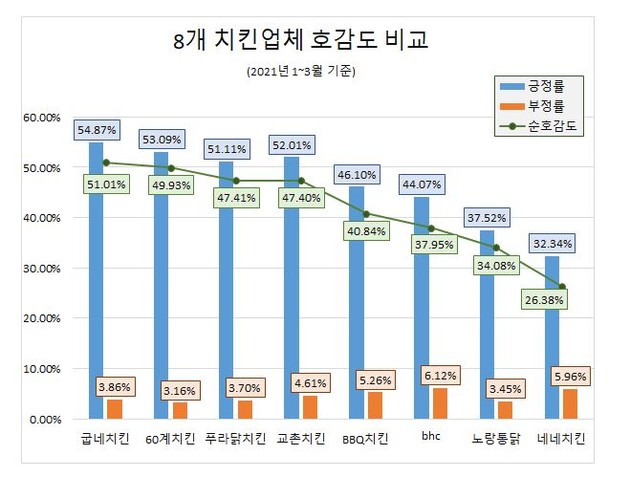 '굽네치킨'은 긍정률에서 부정률을 뺀 값인 '순호감도'에서 51.01%를 기록해 8개 업체중 유일하게 순호감도 50%를 넘겼다.