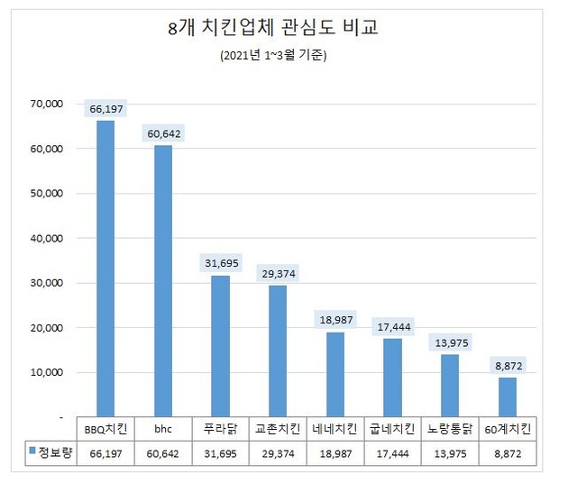 연구소가 임의로 선정한 조사 대상 8개 치킨 브랜드는, 올 1~3월 정보량 순으로 △BBQ치킨(제너시스비비큐, 대표 윤경주) △bhc치킨(비에이치씨, 대표 임금옥) △푸라닭치킨(아이더스코리아, 대표 장성식) △교촌치킨(교촌에프앤비, 대표 소진세, 조은기) △굽네치킨(지앤푸드, 대표 정태용) △네네치킨(혜인식품, 대표 현철호 현광식) △노랑통닭(노랑푸드, 대표 최명록) △60계치킨(장스푸드, 대표 장조웅) 등이다.