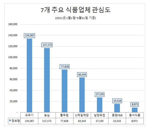 분석 대상 업체는 올 1분기 정보량 순으로 △오뚜기 △농심 △풀무원 △CJ제일제당 △남양유업 △동원F&B △동서식품 등이다.