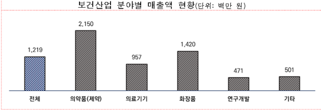 최근 7년간 보건산업 관련 기업이 8801곳 창업했으며, 평균 매출액은 의약품분야가 21억5000만원으로 가장 높은 것으로 파악됐다.