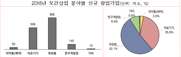 20일 보건복지부와 한국보건산업진흥원이 발표한 ‘보건산업 창업기업 실태조사’에 따르면, 2018년 보건산업 분야 신규창업은 총 1666개, 화장품 분야가 868개(52.1%)로 가장 많았으며, 의료기기 598개(35.9%), 연구개발 140개(8.4%), 의약품 50개(3.0%), 기타 10개(0.6%) 등 순서로 나타났다.