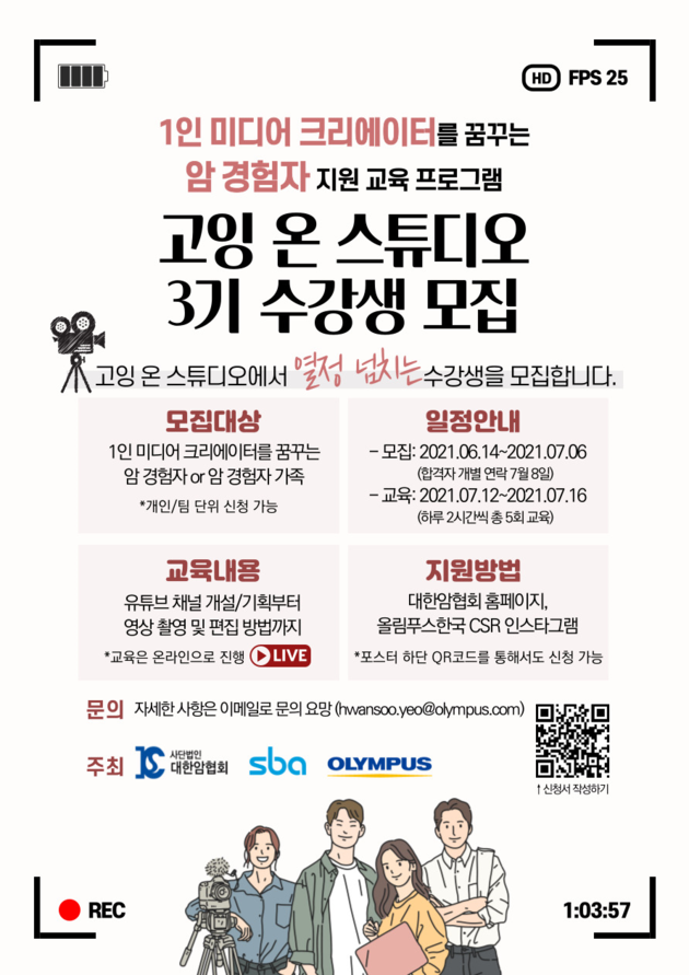글로벌 의료기업 올림푸스한국(대표 오카다 나오키)은 대한암협회(회장 노동영)와 서울산업진흥원(대표이사 장영승)이 함께 암 경험자들에게 1인 크리에이터 육성을 위한 영상 콘텐츠 교육을 제공하는 ‘고잉 온 스튜디오(Going-on Studio) 3기’ 참가자를 모집한다고 밝혔다.