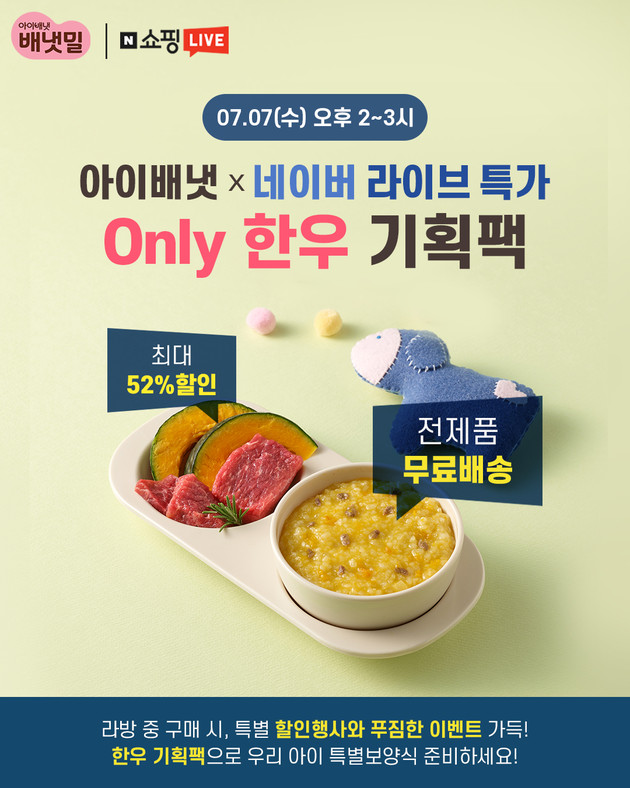 아이배냇의 신선배달 이유식 브랜드 ‘배냇밀’이 7일 오후 2시부터 3시까지 네이버 쇼핑라이브 채널에서 2차 라이브 커머스를 진행한다.