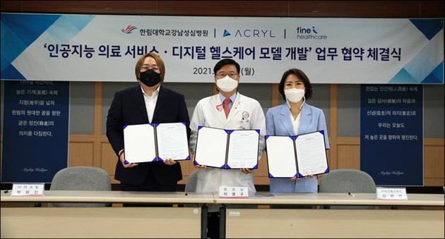 디지털헬스케어 전문기업 파인헬스케어(대표 신현경)은 한림대강남성심병원(병원장 이영구) 및 (대표 박외진)과 디지털헬스케어 신규 비즈니스 모델개발 및 원격의료시스템 해외진출 협력 및 아크릴의 통합 인공지능 플랫폼 '조나단(Jonathan)'을 활용한 인공지능 의료 서비스 공동 개발을 위한 업무협약을 21일 체결했다고 밝혔다.