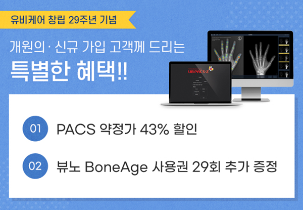 첫번째로 대표 제품 ‘UBPACS-Z(유비 팍스제트)’를 43% 할인 판매한다. ‘UBPACS-Z’는 의학용 영상 정보의 저장, 판독 및 검색 기능 등을 통합적으로 처리하는 고품질 ‘의료 영상 통합 관리 솔루션’으로, 빠른 속도와 안정적인 운영, 철저한 보안성을 갖춰 병·의원의 만족도가 높은 제품이다. 실제로 지난 1분기 제품 매출이 전년동기 대비 40% 가량 성장했다.