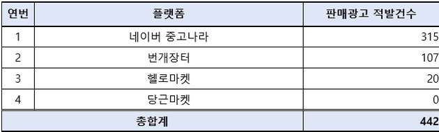 제품별로는 창상피복재 254건, 의료용흡인기 142건, 모유착유기 39건, 콘택트렌즈 7건을 적발했고, 플랫폼 별로는 중고나라 315건, 번개장터 107건, 헬로마켓 20건의 누리집을 적발했다. 다만 점검 대상 중 당근마켓에서는 의료기기 판매·광고 게시글 확인되지 않았다.