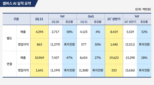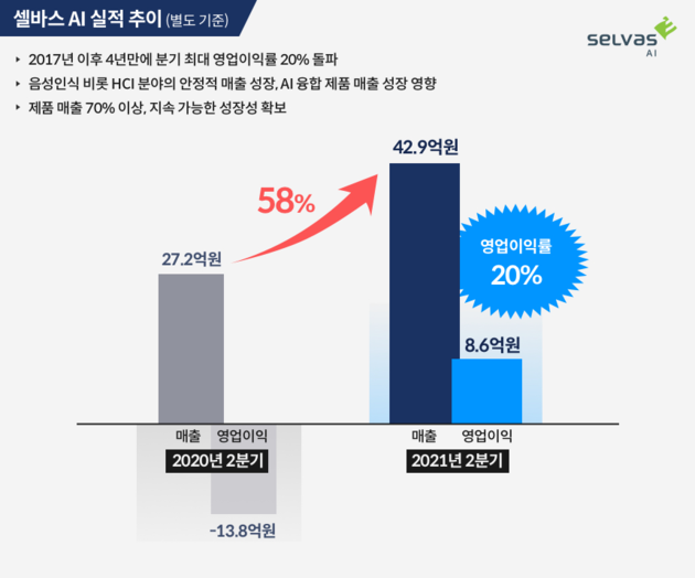 국내 인공지능, 음성기술 대표기업 셀바스 AI는 2021년 2분기 별도 기준 매출액 43억 원을 달성하며 전년 동기 대비 58% 성장했다고 17일 공시를 통해 밝혔다.