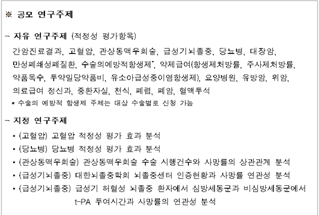 선정된 과제의 연구기간은 2022년 1월부터 12월까지 1년이며 연구에 필요한 자료는 보건의료빅데이터개방시스템(원격분석시스템)을 통해 무료로 제공된다.