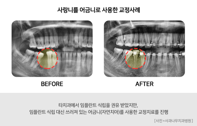 따라서 치아가 상실됐거나 교정치료 계획이 있다면 임플란트 식립 전에 사랑니 여부를 확인하고, 사랑니 활용이 최대한 가능할지 알아보는 것을 추천한다.