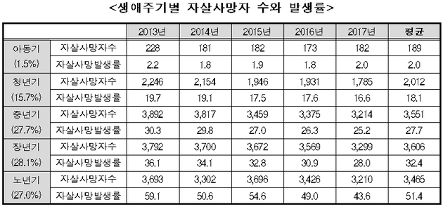 생애주기별 인구 10만 명당 자살사망 발생률은 노년기(51.4명)가 가장 높게 나타났으며, 이어 장년기(32.4명), 중년기(27.7명), 청년기(18.1명) 순으로 나타났다