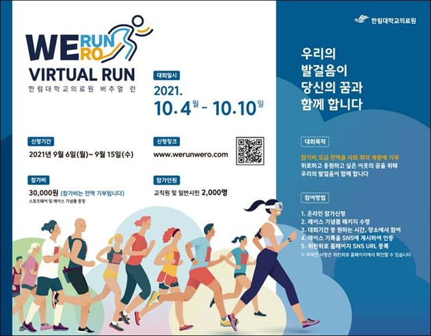 한림대학교의료원은 '위런위로(WeRunWe路): 함께 가는 길, 우리가 함께 달린다' 행사를 2021년 10월 4일부터 10일까지 전국에서 비대면으로 진행한다. 참가 신청은 9월 6일부터 9월 15일까지다.