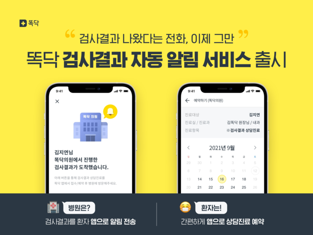 검사결과 자동 알림은 알레르기 검사 등 외부 수탁 검사결과가 나올 경우 자동으로 환자의 똑닥 앱 알림을 통해 알려주는 서비스다. 검사결과 도착 및 내원 안내에 대한 알림이 자동으로 환자에게 전달되고, 환자는 똑닥에서 간편하게 검사결과에 대한 상담진료를 예약할 수 있다.