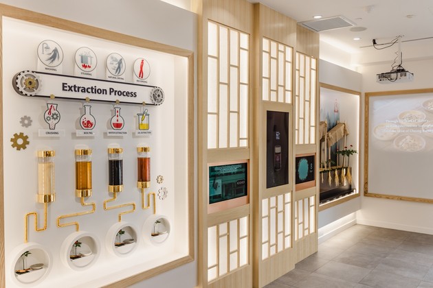 한국 최초의 수출품이자 K 푸드의 시조(始祖)로서의 고려인삼의 역사와 가치, 재배와 가공 방식, 효능 등을 3D 조형물과 디지털 영상을 활용해 시각적으로 재현해낸 것은 물론 매장 한 켠에 마련된 ‘홍삼 브루어리(추출존)’에서는 달임액이 24시간 추출되는 과정을 직접 눈으로 보고 맛볼 수 있게 해 방문객들이 ‘즐거운 경험’을 체험할 수 있도록 만든 것이 특징이다.