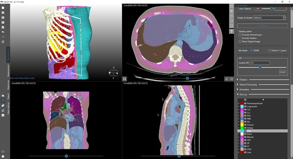 해당 AI 모듈을 활용하면 의료진은 클릭 한 번으로 수 초에서 수 분만에 수백 장의 CT에서 Airway(기도), Artery(동맥), Liver(간), Lung(폐), Pancreas(췌장), Spleen(비장), 뼈(Bone), 체성분(Body Composition) 등 다양한 해부학 구조물을 자동으로 분할할 수 있으며, 해당 영역의 정량화된 정보까지 얻을 수 있다.