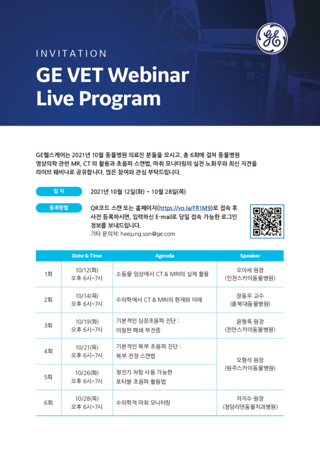 GE헬스케어의 동물병원 맞춤형 솔루션 포트폴리오를 바탕으로 전문 의료진과 준비한 이번 웨비나 프로그램은 ‘소동물 임상에서 CT & MRI 의 실제 활용’(오이세 원장 / 인천스카이동물병원)을 시작으로, ‘수의학에서 CT & MRI 의 현재와 미래’(장동우 교수 / 충북대동물병원), ‘기본적인 심장초음파 진단 이첨판 폐쇄 부전증’(윤형록 원장 / 천안스카이동물병원), ‘기본적인 복부 초음파 진단 복부 전장 스캔법’(오형석 원장 / 원주스카이동물병원), ‘청진기처럼 사용 가능한 포터블 초음파 활용법’(오형석 원장 / 원주스카이동물병원), ‘수의학적 마취 모니터링’(차지수 원장 / 청담리덴동물치과병원)’ 을 주제로 진행할 예정이다.