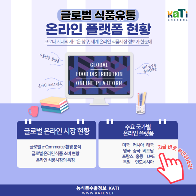 한국농수산식품유통공사(사장 김춘진)는 한국 농식품의 글로벌 온라인시장 진출 확대를 돕기 위해 ‘글로벌 식품유통 온라인 플랫폼 현황’ 보고서를 발간했다.