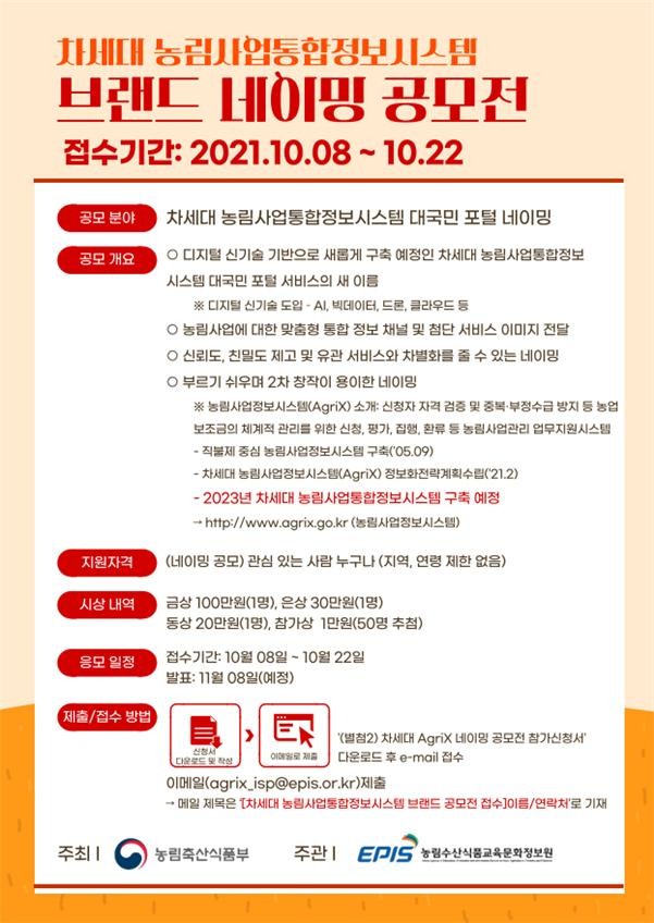 새롭게 변화되는 대국민 포털 서비스 네이밍 공모전에는 누구나 응모할 수 있으며, 농림사업에 대한 맞춤형 통합 정보 채널 이미지, 신뢰도와 친밀도를 제고하고 유관 서비스와의 차별화를 줄 수 있는 브랜드 네이밍을 제시해야 한다.
